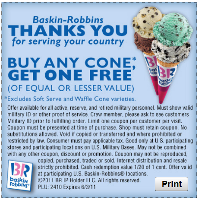 Veterans and Active Military stop into Baskin Robbins for BOGO ice cream cones. To get your coupon, just like Baskin Robbins on Facebook and then print your coupon! Coupon expires June 3rd.