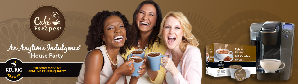 Any time is a great time for a sweet escape. At your Café Escapes® “An Anytime Indulgence®” House Party, you and your guests will enjoy getting together with friends and discovering the decadent Café Escapes® flavors from hot cocoa and café mocha to chai latte and more. Using your Keurig® K-Cup® brewer, savor the six delicious flavors of hot, freshly brewed beverages paired with sweet treats, fun party activities and enjoy some uplifting downtime.