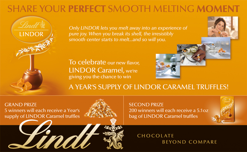 - Grand Prize: Five winners will each receive a YEAR’S SUPPLY OF LINDOR CARAMEL TRUFFLES