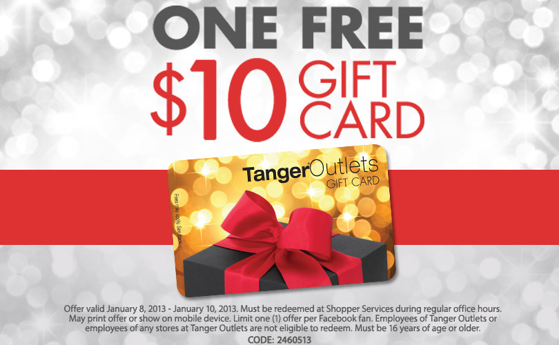 Head over to the Tanger Outlet Facebook page and receive a FREE $10 Tanger Outlet Gift Card. You can print the offer or just show it on your phone, to someone at Shopper Services to get your FREE card.