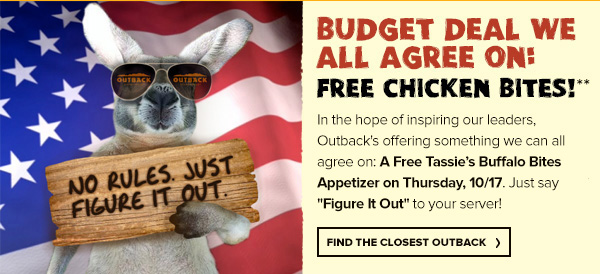 Stop by Outback Steakhouse to receive FREE Chicken Bites. Just tell your server "Figure It Out". This offer is valid on Oct.17th only.