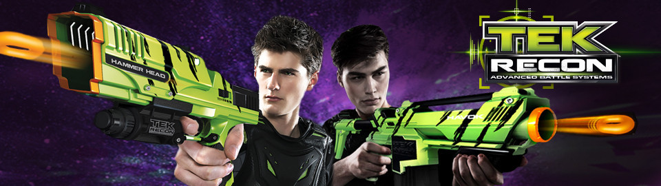 - 1 Tek Recon™ Battle Pack, featuring 2 Tek Recon™ Hammer Head Blasters, 30 NRG Rounds, 2 smartphone mounts, 2 exploding targets and 1 scannable game flag