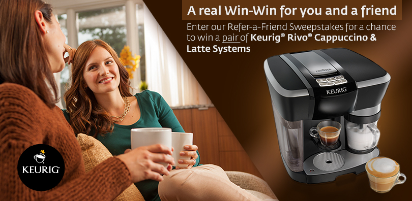 Now through October 17th, you can enter to win a FREE Keurig Rivo Cappuccino & Latte System for both you AND a friend! A total of 5 lucky entrants will score two Keurig Vue machines, worth $460 total.