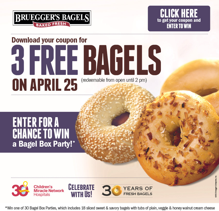 Head over to the Bruegger’s Bagels Facebook page and like them to receive a coupon for 3 FREE bagels on April 25th.