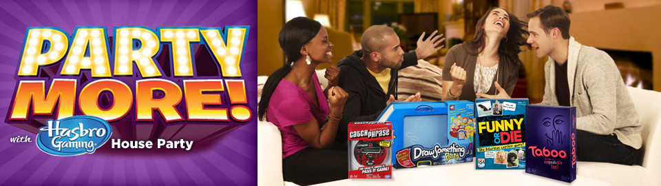 Hasbro Party Games brings out the party in everyone! See for yourself at your Hasbro Party Games House Party featuring the New FUNNY OR DIE, New DRAW SOMETHING PARTY, TABOO and Electronic CATCH PHRASE games. Show your friends how they can Party More with Hasbro Party Games and push funny to the limit with lots of laughs, cheering, jeering and joking all night long.