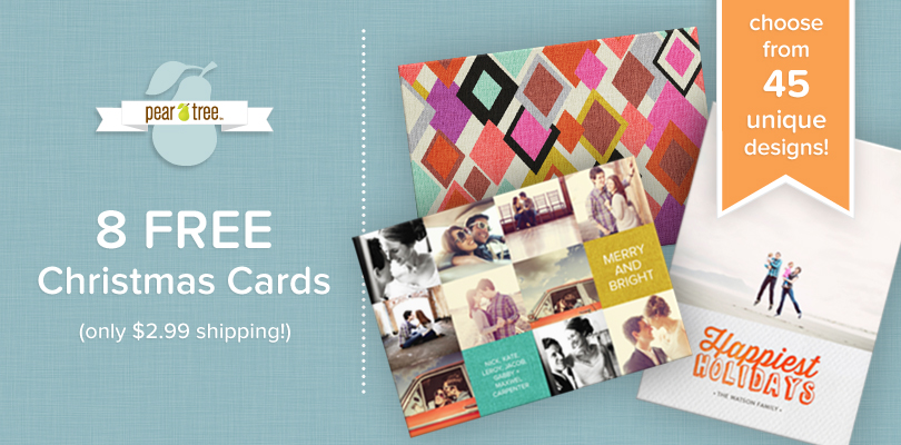 Go to the Pear Tree Greetings Facebook page, click on the 8 FREE Cards tab and enter your email address to get a unique promo code valid for 8 FREE Christmas Cards (a $12.78 value) – choose from over 45 different designs!