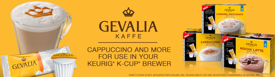 Let GEVALIA show you how to create exquisite café-style beverages — like Cappuccino, Mocha Latte or Caramel Macchiato — at home with your Keurig® K-Cup® brewer. You simply combine their rich, never bitter Espresso Roast Coffee with their unique froth packet, made from real milk.