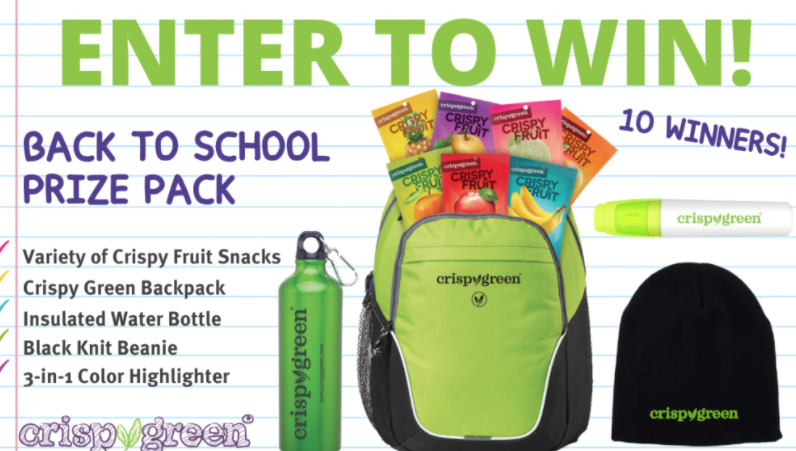 /Enter this new Crispy Green “Back to School Prize Pack” Sweepstakes and you could win 1 of 10 awesome prize packs worth $100! The 10 lucky winners will get a water bottle, beanie, highlighter, and a backpack full of Crispy Fruit to help you get in “back to school” mode.