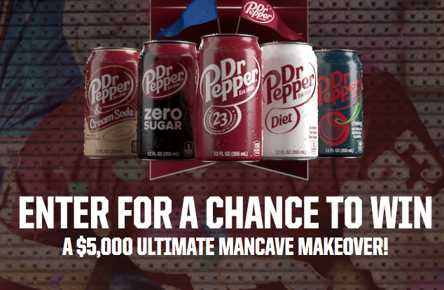 October 01, 2021 Dr Pepper Mancave Sweeps October 01, 2021/ Diane Schmidt Score a $5,000 ultimate mancave makeover in this Dr. Pepper “Ultimate Mancave Makeover” Sweepstakes.