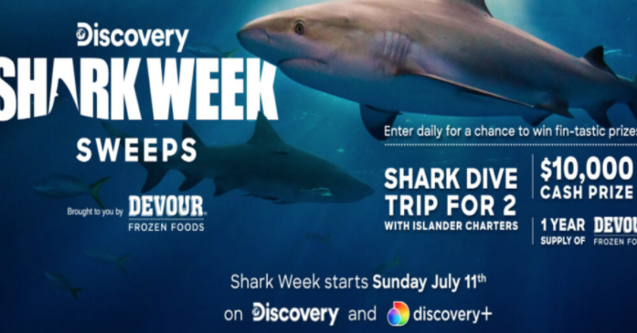 One grand prize winner will score a trip to San Diego, a $10,000 check, AND 1-year supply of Devour frozen meals- Discovery Shark Week Sweepstakes.