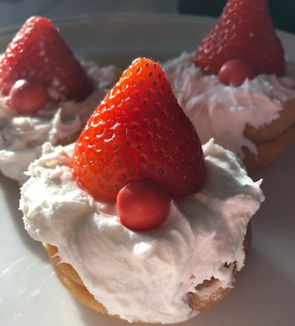 Wash your strawberries and cut out the crowns in a v shape. This creates a hat shape in the strawberry when turned upside down.